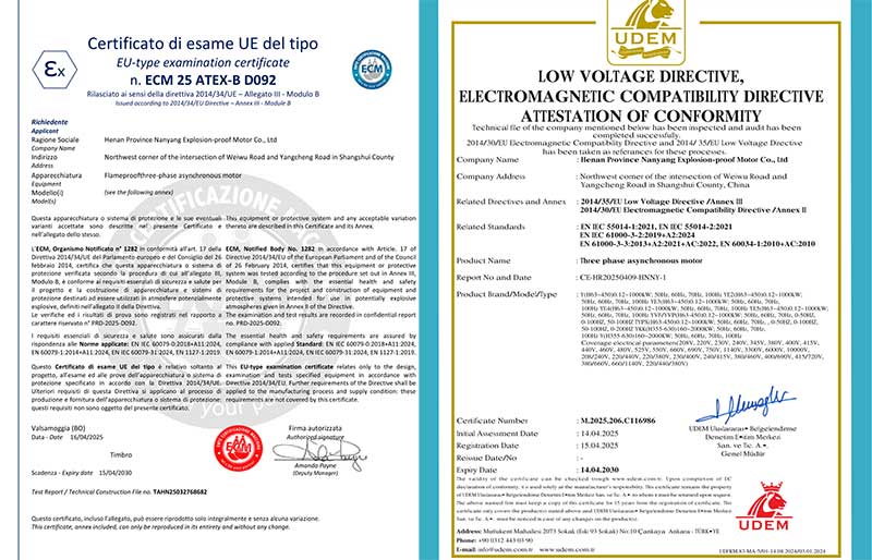 近日,河南省南洋防爆電機有限公司傳來喜訊:公司自主研發生產的防爆電機產品,順利通過權威機構的嚴格檢測與審核,正式獲得CE認證證書與ECM 25 ATEX-B D092證書。這兩項國際權威認證的取得,不僅標志著南洋防爆電機的產品質量、安全性能達到了國際標準,也為企業進一步拓展海外市場奠定了堅實基礎。